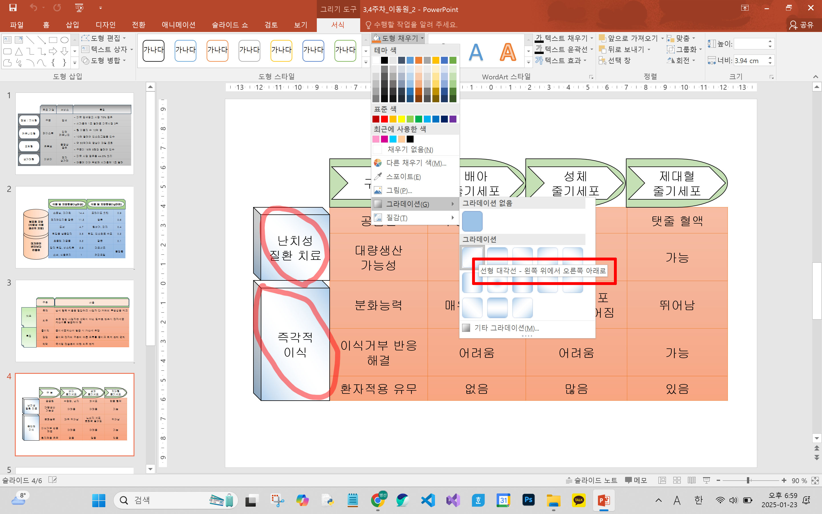 질문 : 4번슬라이드에서 도형그라데이션 효과 중 선형 대각선이 4개가 있는데 무엇을 골라야하나요?